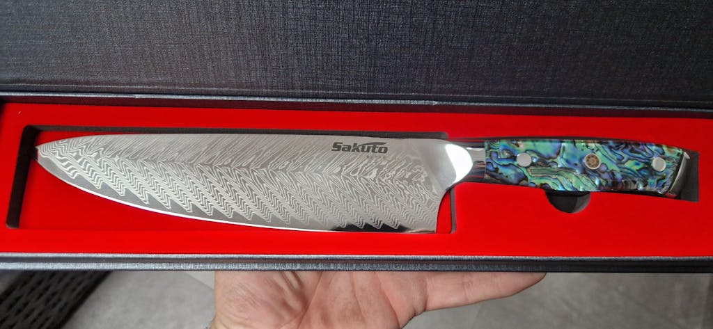 My knife arrived today. First of all it's looks amazing, the feather pattern is very clean and the abalone handle realy sets it off. It's very sharp and cuts very well. I'll definitely be buying more to complete the set. Delivery was a bit slow but that was down to Royal Mail not sakuto.