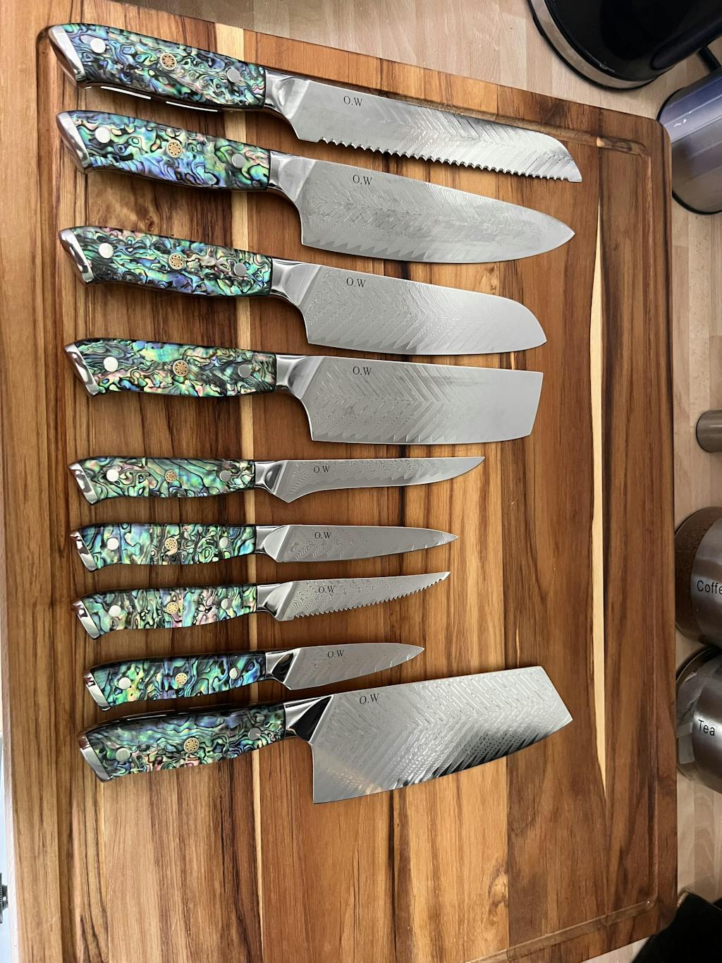 I received the set of 9 knives with the abalone handles as a birthday present. They were packaged and presented very well and look absolutely beautiful. The handles are very comfortable and all the knives are very balanced in the hand. The blade pattern is stunning. They slice vegetables as thin as you want and cutting through meat feels like cutting silk. I spent two years looking at the set trying to decide whether or not to risk buying them! I thoroughly recommend them and wish I had taken the plunge and purchased them sooner